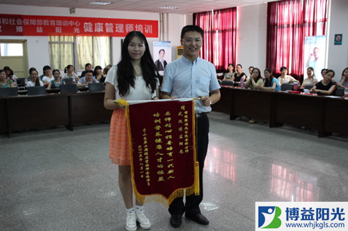 第二期班的学员杨艳同学代表全体同学世健联湖北分院(武汉博益阳光)送上了饱含感激之情的锦旗,并热情地表示,青山区第二期健康管理师班的学员们在此次培训中收获甚多,一切尽在不言中!