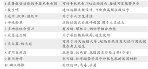 扩充版清单则更全面、更具有针对性,包括6大类、18小类共60种物品,增加了食品、毛巾、牙膏等个人物品,重要文件材料如适量现金、户口本、身份证等。