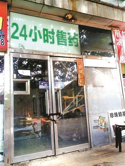 一把大锁锁住了两块裂开了几道缝隙的玻璃,在朝阳区东坝中街与驹子房路交叉路口一直向西,几棵树木挡住了一家底商的招牌。在相邻的饮品店与烧饼店中间,这家标注着“24小时售药”的药店大门紧锁。