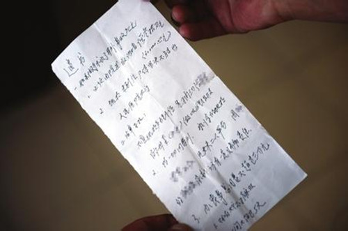 据介绍,8日医护人员做完手术后,看到了这张遗书,听护士说遗书是从病人眼镜盒里掉出来的。