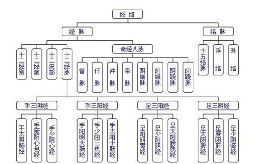 经络的运行也相同,而其顺序为手三阴、手三阳、足三阳与足三阴,也是从经脉到络脉、然后到孙脉,再从孙脉连接到另外一个经脉系统。