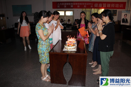 世健联湖北分院(武汉博益阳光)刘波院长更是给二期班7月份过生日的学员们送上了可口的生日蛋糕,令学员们感动不已,更令在场的青山区卫计委领导们颇为惊喜,张斌书记不无感慨地说:“这次将是青山区第二期健康管理师培训班学员最难忘的一次培训!”
