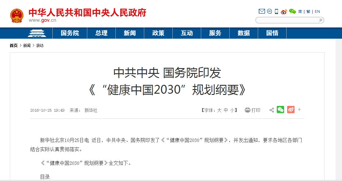 日前中共中央、国务院印发了《“健康中国2030”规划纲要》其中明确指出,把健康摆在优先发展的战略地位,立足国情,将促进健康的理念融入公共政策制定实施的全过程,加快形成有利于健康的生活方式、生态环境和经济社会发展模式,实现健康与经济社会良性协调发展。