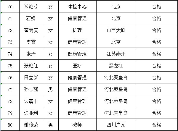 全国第26期健康管理师班80名学员顺利通过考试,获得由国家人力资源和社会保障部颁发的证书,健康管理师通过名单公布的那一天,有人喜极而泣,因为有些人付出了很多汗水,有些人经常加点复习所学的知识,就为了这一天。看到自己的名字在公布栏中,又是激动,又是兴奋。