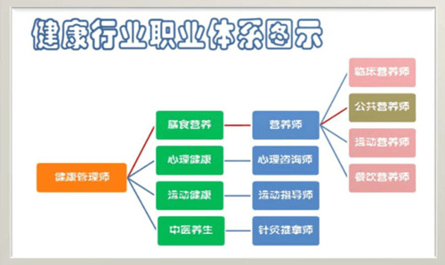从图中可看出,健康产业中最高端的最全面的职业是健康管理师。健康管理师是从事于个体和群体健 康的检测、分析、评估及健康咨询、指导和危险因素的干预等工作的专业人员。健康管理师的知识层次涵盖了膳食营养、心理健康、运动健康、中医养生等领域。而公共营养师是健康管理师下面的一个分支。营养师的作用总体来讲可以用两句话概括”吃什么“和”怎么吃“。而健康管理师是对人进行整体的健康分析与评估,从营养、运动、心理和养生四大方面来进行健康管理。