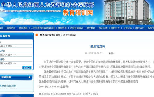 在生活水平的不断发展之中,人们对于健康的关注度也是越来越高。健康的重要性也是越来越凸显的明显了。为了适应全面建设小康社会的需要,提高全民族的健康意识和身体素质,培养和造就健康管理人才,人力资源和社会保障部教育培训中心与北京世健联健商医学研究院共同推出健康管理师岗位能力培训课程。