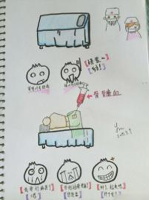 除此之外,杨蒙还画了“记一次很不爽的抽血经历”、“记第27次骨穿”、“三八妇女节”等,她给这些手绘起名叫“包子的抗癌日记”。为什么叫包子?杨蒙说,同学们都在外面学习游玩,增长见识,而自己只能困在病房里,在各种激素的摧残下,自己的脸经常肿得像包子。