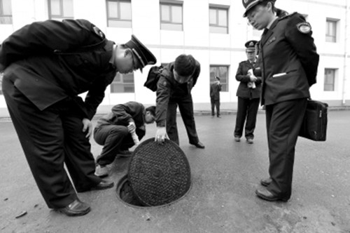 医院后勤的负责人打开市政井盖供卫生监督人员检查。