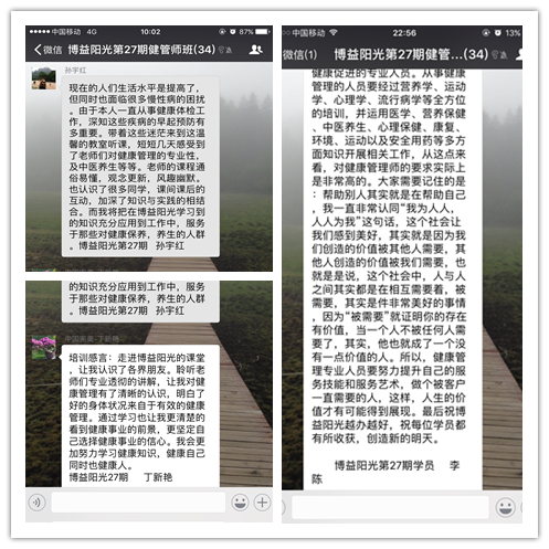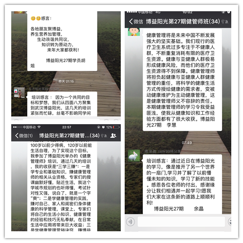 学员王亚雁说到:“通过几天的培训,我的收获是“三学三赚”:一是学专业和基础知识,赚健康管理师的相关从业资格;二是学健康管理的实践,赚对自己、家人和朋友们身体健康的科学管理;三是学健康管理营销诀窍,赚博益阳光智囊团,博益阳光是为育才而培训,真正做到以培训人才,打造新形势下新的创业平台而培训,加入博益阳光大家庭可以复训,可向有关专家咨询,还结识了一群志同道合的战友、同学。”