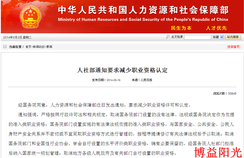 人力资源和社会保障部副部长王晓初表示,减少职业资格的许可和认定,是深化行政审批制度改革、加快政府职能转变的一项重要任务,目前人力资源和社会保障部正在抓紧修订国家职业标准,转变监管方式,打掉市场主体创业兴业的“拦路虎”。