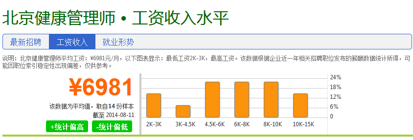 拿北京为例,北京健康管理师平均工资:¥6981元/月,其中23%从业者月薪8千至1万,其中15%的健康管理师从业者可以拿到高达1.5万的月薪。从目前各个行业工资标准来看,健康管理师的工资显得十分诱人。